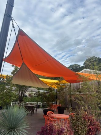 シェードの生地には、SOLTIS 92を採用。イングリッシュガーデンさながらの草花や芝生スペースが見られるエントランス奥に日陰を作る目的で設置された3色のシェードは視覚的にも風景にマッチしています。