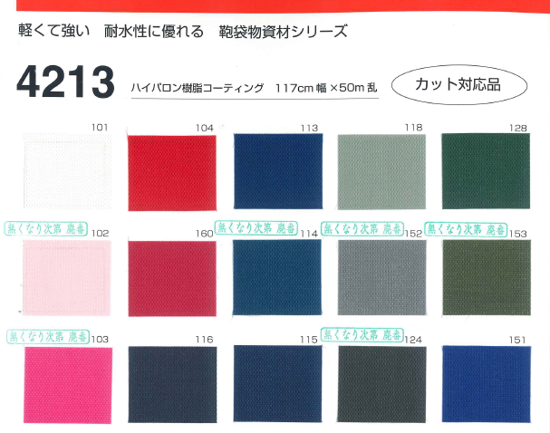 鞄の裏地やカバーへお使いいただきやすいよう定番カラーを取り揃えました。 蛍光色(4214)もラインナップに加え、安全・防犯グッズ等への用途展開も可能になりました。